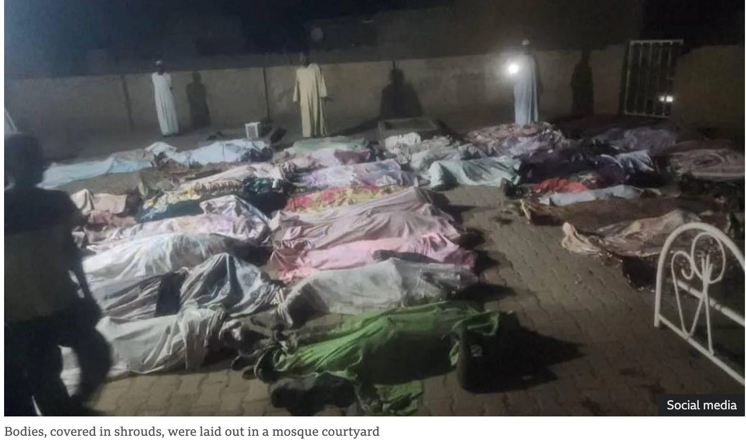 One of the leaders of the Rapid Support Forces (RSF) militia, Kikel, had defected and joined the Sudanese army. Regardless of the immorality of the army accepting a former criminal without accountability, this event emboldened the RSF, a terrorist force, to attack several villages with populations of no more than two thousand each, displacing their inhabitants en masse after indiscriminately killing hundreds. The largest of these massacres occurred in the village of Al-Sariha. Because the aim of the killings was to terrorize civilians and use them to punish the military (targeting the social base of Kikel’s forces), the RSF filmed their crimes and disseminated them online. The BBC used these images to identify many of the perpetrators.